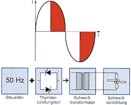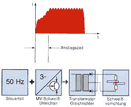Methode:In einer speziellen Invertersteuerungen wird die dreiphasige Netzspannung gleichgerichtet und zu einer 1000 Hz Wechselspannung umgeformt. Diese Spannung wird auf einem kompakten, eng gekoppelten Transformator gegeben und sekundärseitig wieder gleich gerichtet. So entsteht für die Schweißung ein Gleichstrom, der, bedingt durch die 1000 Hz, schnell und genau geregelt werden kann.Vorteile: